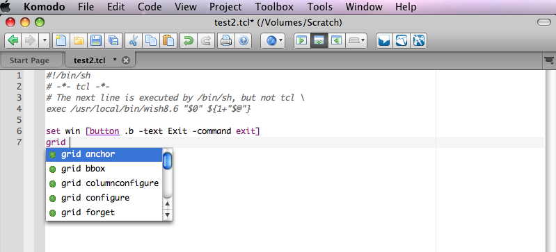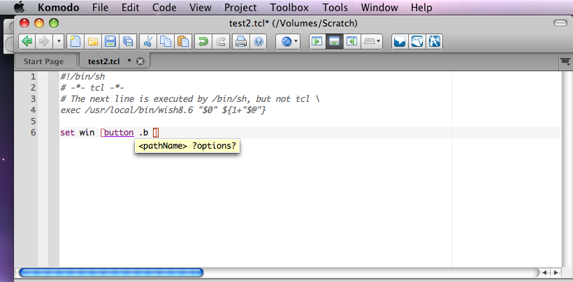 As you type, Komodo will give you hints about the command syntax and possible commands and will automatically close any quote, parenthesis, bracket or brace that you open.