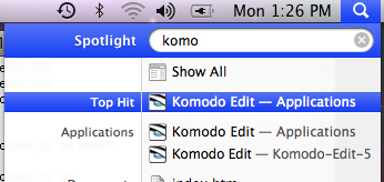2. Start Komodo Edit by clicking the Spotlight icon in the upper right corner of your screen.