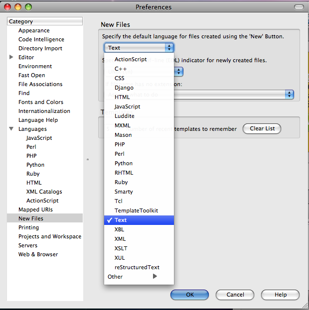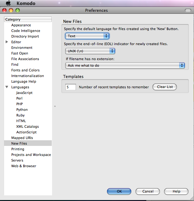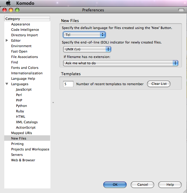 4. Click the New Files item from the left menu to set Komodo to use Tcl as the file type. When you first click New Files you'll see this;