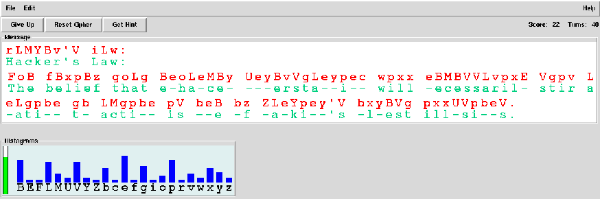 What it isThis is a simple substitution cipher solving game. You get humorous quotes in cipher text and have to figure out what they are in plaintext.You do this by clicking a the appropriate buttons to change the mapping of symbols. When you start, it will be easy. As you progress, it will get harder. |